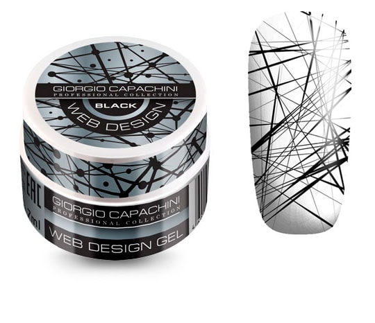 Stretching design gels WEB DESIGN. It is an elastic gel that can stretch like a spider web and create unique and original designs. WEB DESIGN colors in white, black and red have no sticky layer, gold and silver with a sticky layer. Do not require a top coat application. Hardens on a UV lamp, in about 2 minutes, in an LED lamp, in about 1 minute. Removal can easlily be done by filing off.
